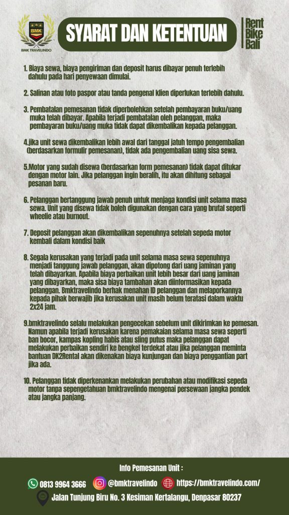 BMK Travelindo is the best motorcycle rental service in Bali, offering a wide selection of well-maintained and high-quality motorbikes at affordable prices. We prioritize customer satisfaction with easy booking, flexible rental terms, and excellent customer service.